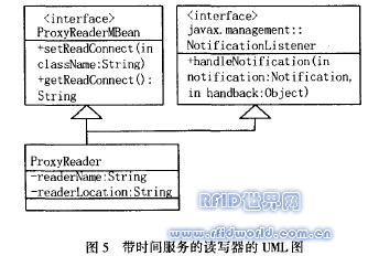 在本系统中将每个读写器模块的远程方法调用封装为一个管理组件(MBean)作为JMX服务器的实例注册到JMX服务器中。通过JMX框架对读写器进行监控和管理,使RFID中间件系统能提供管理、监控读写器的功能。本部分描述为读写器管理组件添加时间服务,以达到定时控制读写器的目的。JMX时间服务在指定的日期和时间触发消息;也可以在一个固定间隔重复触发消息。时间服务由一个MBean实现并可以管理,能够发送它指定的TimerNotification类的消息实例。javax.management.NotificationListener由想要接收通知的对象来实现,实现方法handleNotification。对于定期通知,则使用固定延迟执行方案,如在Timer中指定的那样。为了使用固定速率执行方案,要使用addNotification方法。图5为读写器时间服务的UML设计图。